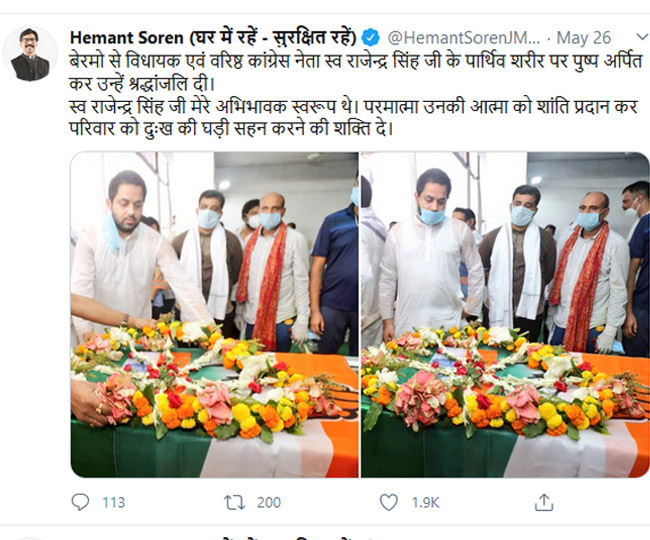 मुख्यमंत्री हेमंत सोरेन मंगलवार को वरिष्ठ कांग्रेस नेता स्व. राजेन्द्र सिंह को श्रद्धांजलि देने पहुंचे थे। इस दौरान वहां काफी भीड़ थी। सीएम ने ट्वीट करके कहा, “बेरमो से विधायक एवं वरिष्ठ कांग्रेस नेता स्व राजेन्द्र सिंह जी के पार्थिव शरीर पर पुष्प अर्पित कर उन्हें श्रद्धांजलि दी। राजेन्द्र सिंह मेरे अभिभावक स्वरूप थे। परमात्मा उनकी आत्मा को शांति प्रदान कर परिवार को दुःख की घड़ी सहन करने की शक्ति दें।” सीएम ने श्रद्धांजलि देते हुए दो फोटो भी ट्वीटर पर शेयर किया है। भाजपा इसी को आधार बनाकर हेमंत सोरेन पर कार्रवाई की मांग कर रही है।
