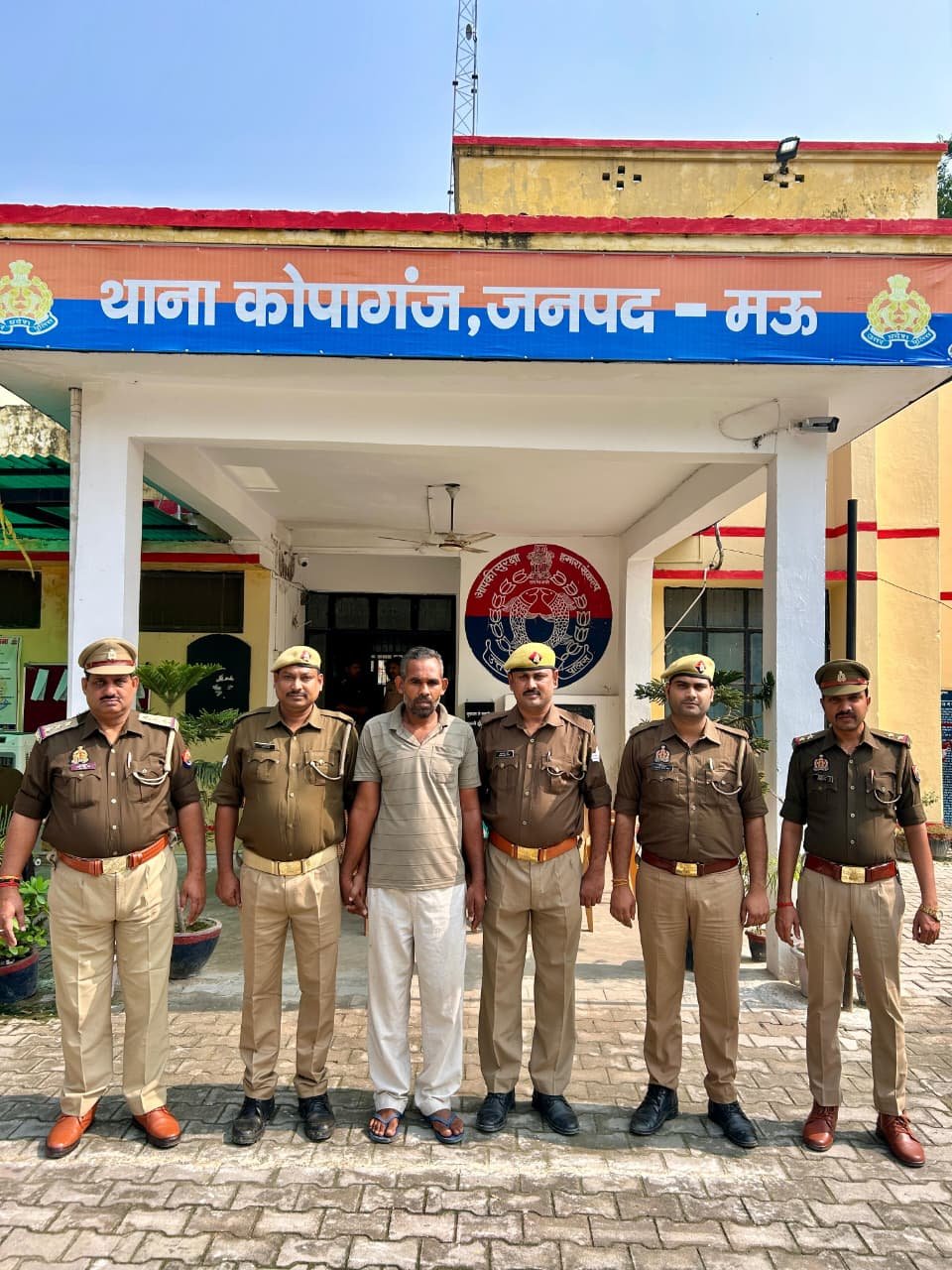 पुलिस अधीक्षक मऊ श्री इलामारन जी के निर्देशन में अपराध/अपराधियों के विरूद्ध चलाये जा रहे अभियान के क्रम में अपर पुलिस अधीक्षक श्री अनूप कुमार के कुशल पर्वेक्षण में तथा क्षेत्राधिकारी घोसी श्री जितेन्द्र सिंह के कुशल नेतृत्व में दिनांक 02.11.2025 को थाना कोपागंज पुलिस टीम द्वारा देखभाल क्षेत्र/ चेकिंग के दौरान जरिये मुखबिर कि सूचना पर इंदारा रेलवे स्टेशन रोड़ के पास सड़क के किनारे के पास द्वारा थाना दोहरीघाट जनपद मऊ पर पंजीकृत मु0अ0सं0 111/2025 धारा 3(1) उ0प्र0 गिरोह बन्द एंव समाज विरोधी क्रिया कलाप निवारण अधिनियम 1986 से सम्बन्धित, 25,000 रुपये पुरस्कार घोषित/वांछित एक नफर अभियुक्त अनिल यादव पुत्र मिठ्ठू यादव निवासी तिवारी के मिल्की थाना बैरिया जनपद बलिया गिरफ्तार कर चालान न्यायालय किया गया ।