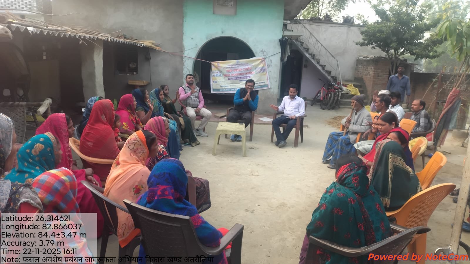कृषकों के मध्य जागरुकता पैदा करने हेतु जिला कृषि रक्षा अधिकारी श्री हिमांचल सोनकर एवं सहायक विकास अधिकारी (कृषि) पल्हनी श्री राजन कुमार द्वारा क्षेत्रीय कार्मिको के साथ ग्रामसभा जमालपुर बाजबहादुर विकासखण्ड-पल्हनी में सभी ग्राम वासियों को फसल अवशेष न जलाने एवं उसे वेस्ट डी-कम्पोजर के माध्यम से उपचारित करते हुए कम्पोस्ट खाद तैयार किये जाने की विधि बताई गयी। उनके द्वारा कृषकों को प्रेरित किया गया कि इस जानकारी को अपने सहयोगियों एवं परिचितो के साथ भी साझा करें।