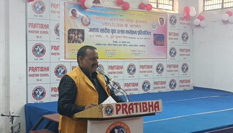 आजमगढ़ 22 नवम्बर– युवा कल्याण एवं प्रान्तीय रक्षक दल विभाग आजमगढ़ के संयुक्त तत्वाधान में राष्ट्रीय युवा उत्सव हेतु निर्धारित विकसित भारत यंग लीडर डायलॉग 2026 के अन्तर्गत आयोजित एक दिवसीय जनपद स्तरीय युवा उत्सव एवं साइंस मेला कार्यक्रम/प्रतियोगिता प्रतिभा निकेतन इण्टर कालेज अतलस पोखरा आजमगढ़ में सम्पन्न हुई। जनपद स्तरीय युवा उत्सव एवं साइंस मेला कार्यक्रम/प्रतियोगिता का शुभारम्भ मा0 श्री ध्रुव कुमार सिंह जिलाध्यक्ष आजमगढ़ द्वारा अपने कर कमलों से मॉ विणावादिनी की प्रतिमा पर माल्यार्पण एवं दीप प्रज्जवलित करके किया गया।