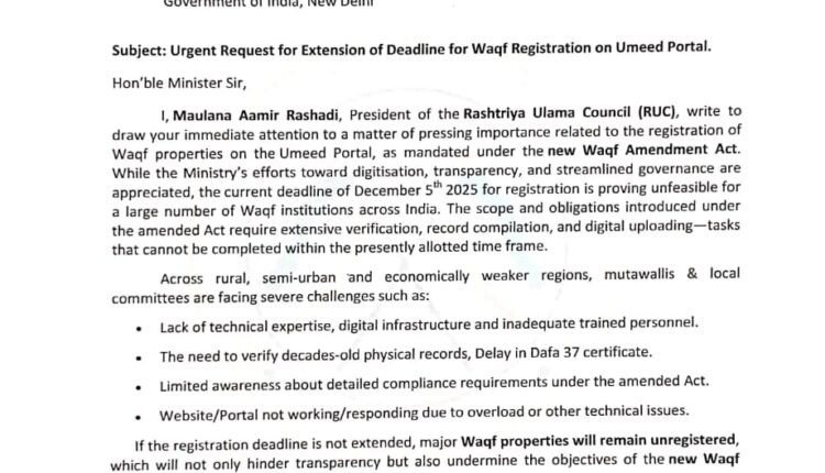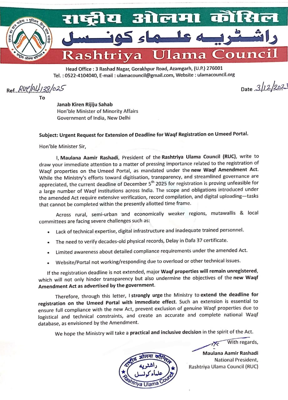 Rashtriya Ulama Council के राष्ट्रीय अध्यक्ष Maulana Aamir Rashadi Madni साहब ने आज भारत सरकार के अल्पसंख्यक मामलों के मंत्री को ख़त लिखकर अपील किया है कि ‘उम्मीद पोर्टल’ की आखरी तारीख बढ़ाई जाए ताकि अभी तक बहुत सी बाकी वक्फ संपत्तियों को भी आसानी और मुकम्मल तौर पर दर्ज किया जा सके। यह कदम मुल्क भर की वक्फ जायदाद के तहफ़्फ़ुज़, शफ्फाफियत और इंतेज़ाम के लिए बेहद ज़रूरी है।