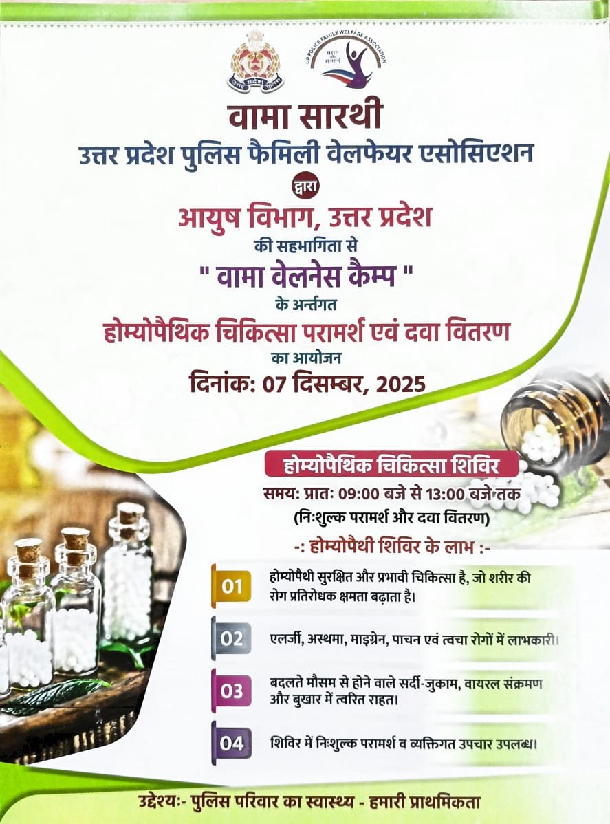 कल दिनाँक 07.12.2025 (रविवार) को वामा सारथी पुलिस फैमिली वेलफेयर एसोसिएशन एवं वरिष्ठ पुलिस अधीक्षक डॉ0 अनिल कुमार के निर्देशन से पुलिस लाइन आजमगढ़ में होम्योपैथिक स्वास्थ्य शिविर का आयोजन किया जाएगा अतः आप सभी लोग समय अधिक से अधिक संख्या में प्रातः 09:00 बजे होम्योपैथिक विशेषज्ञ डॉक्टरों द्वारा निःशुल्क उपचार एवं दवा प्राप्त करने हेतु उपस्थित होकर लाभान्वित हों ।