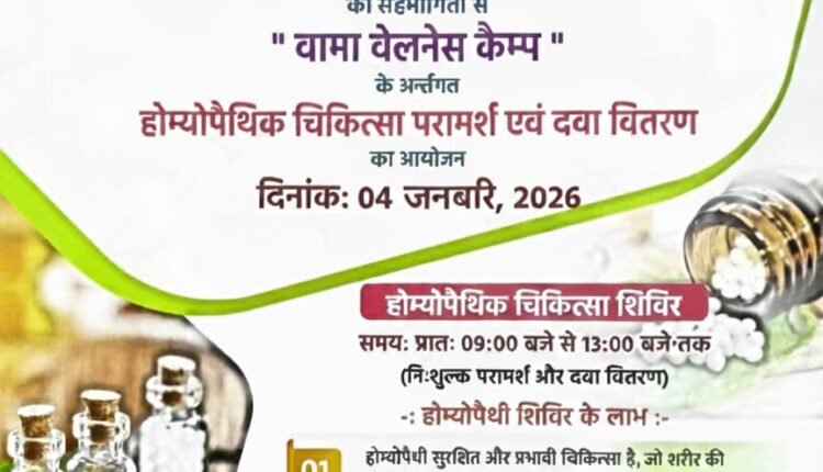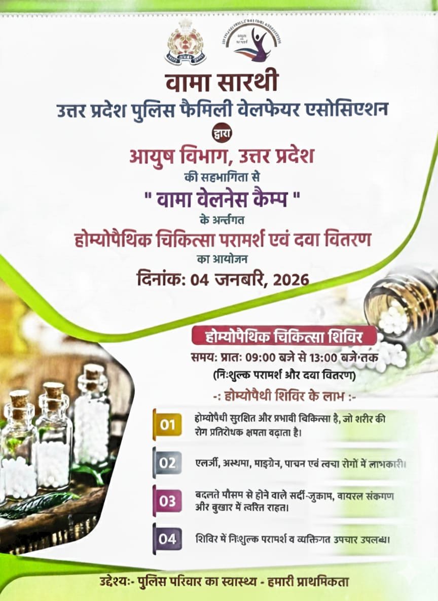 कल दिनाँक 04.01.2026 (रविवार) को वामा सारथी पुलिस फैमिली वेलफेयर एसोसिएशन एवं वरिष्ठ पुलिस अधीक्षक डॉ0 अनिल कुमार के निर्देशन से पुलिस लाइन आजमगढ़ में होम्योपैथिक स्वास्थ्य शिविर का आयोजन किया जाएगा अतः आप सभी लोग समय अधिक से अधिक संख्या में प्रातः 09:00 बजे होम्योपैथिक विशेषज्ञ डॉक्टरों द्वारा निःशुल्क उपचार एवं दवा प्राप्त करने हेतु उपस्थित होकर लाभान्वित हों ।