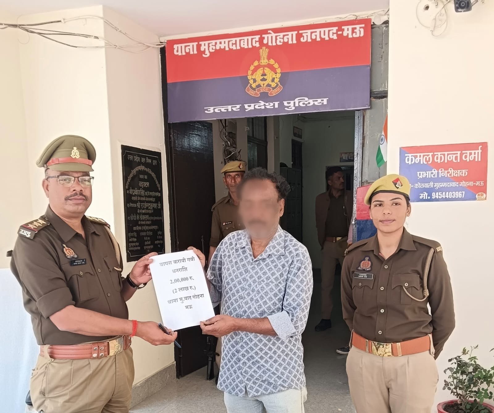 पुलिस अधीक्षक मऊ श्री इलामारन जी के निर्देशन में अपराध/अपराधियों के विरूद्ध चलाये जा रहे अभियान के क्रम में साइबर अपराध के माध्यम से आंनलाइन ठगी गयी धनराशि वापस दिलाने व साइबर अपराध पर प्रभावी कार्यवाही के परिप्रेक्ष्य में थाना मुहम्मदाबाद पुलिस टीम द्वारा सार्थक प्रयास करते हुए यूपीआई के माध्यम से अंजान व्यक्ति द्वारा फ्राड की गयी 200000, /- रु0 कुल धनराशि (दो लाख रुपये ) पीडित मृत्युंजय सिंह पुत्र रमाशंकर सिंह निवासी देवसीपुर थाना मुहम्मदाबाद गोहना जनपद मऊ। आवेदक के कुल धनराशि 200000 रुपये की सम्पूर्ण धनराशि अथक प्रयास कर उनके खाते में वापस कराया गया। आवेदक द्वारा उच्चाधिकारियों व थाना मुहम्मदाबाद के अधिकारी/कर्मचारियों का आभार व्यक्त किया। साइबर अपराध किसी के साथ और किसी भी प्रकार से घटित हो सकता है। बस जागरुक रहकर ही साइबर अपराध से बचा जा सकता है।