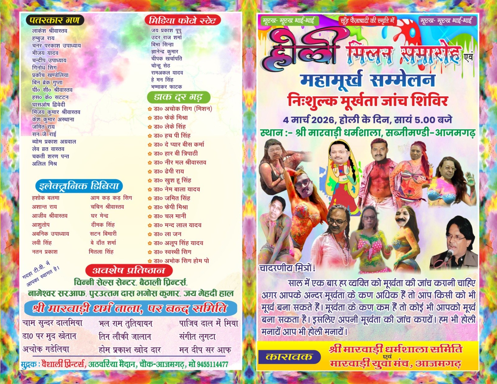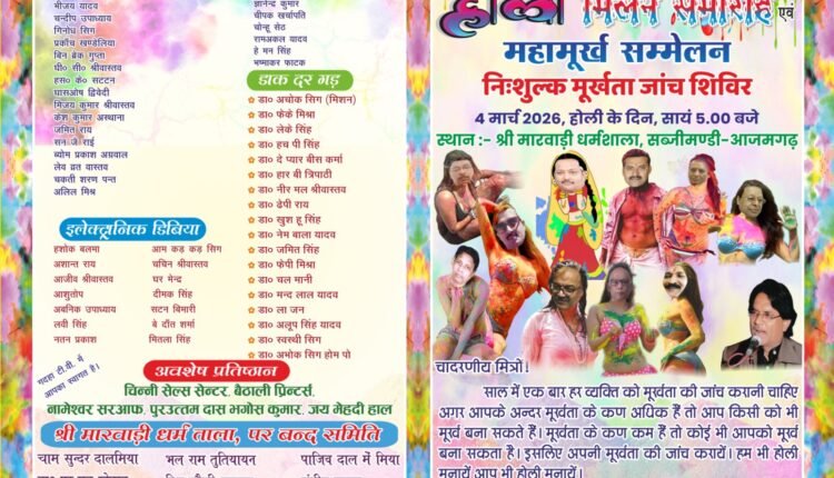 *TV20 NEWS || AZAMGARH :होली की शाम शिविर लगाकर होगी निःशुल्क मूर्खता की जांच,श्री मारवाड़ी धर्मशाला समिति की ओर से होली मिलन समारोह एवं महामूर्ख सम्मेलन का आयोजन*