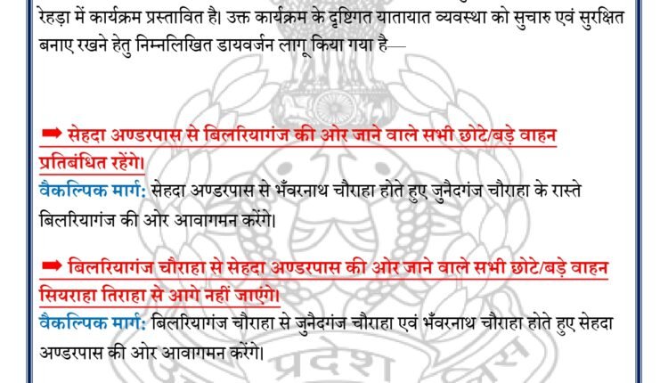 ➡ सेहदा अण्डरपास से बिलरियागंज की ओर जाने वाले सभी छोटे/बड़े वाहन प्रतिबंधित रहेंगे।
