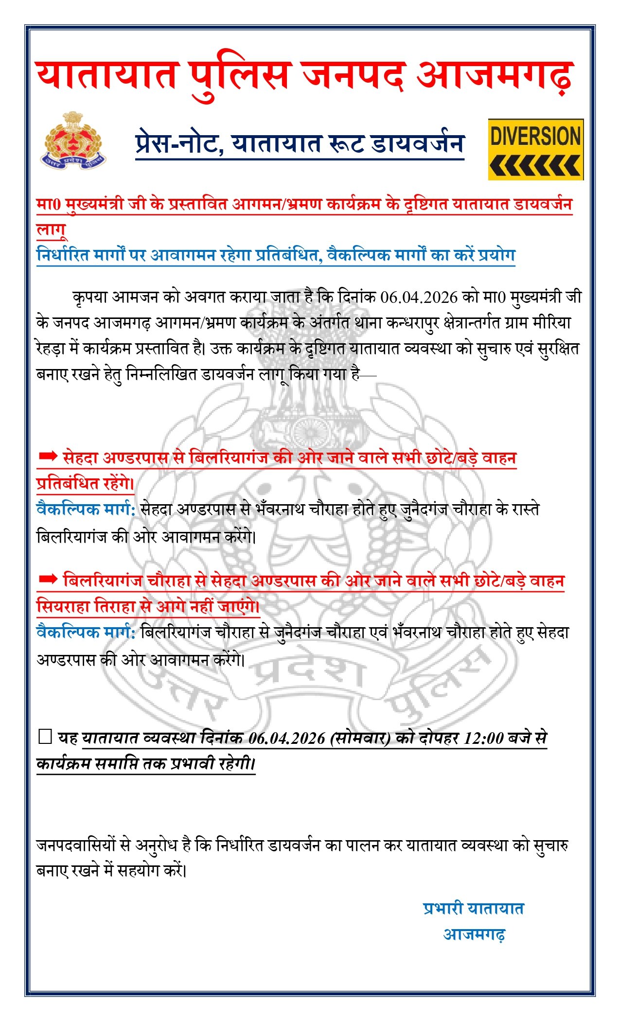 कृपया आमजन को अवगत कराया जाता है कि दिनांक 06.04.2026 को प्रस्तावित मा0 मुख्यमंत्री जी के जनपद आजमगढ़ आगमन/भ्रमण कार्यक्रम के अंतर्गत थाना कन्धरापुर क्षेत्रान्तर्गत ग्राम मीरिया रेहड़ा में कार्यक्रम प्रस्तावित है। उक्त कार्यक्रम के दृष्टिगत यातायात व्यवस्था को सुचारु एवं सुरक्षित बनाए रखने हेतु निम्नलिखित डायवर्जन लागू किया गया है—
