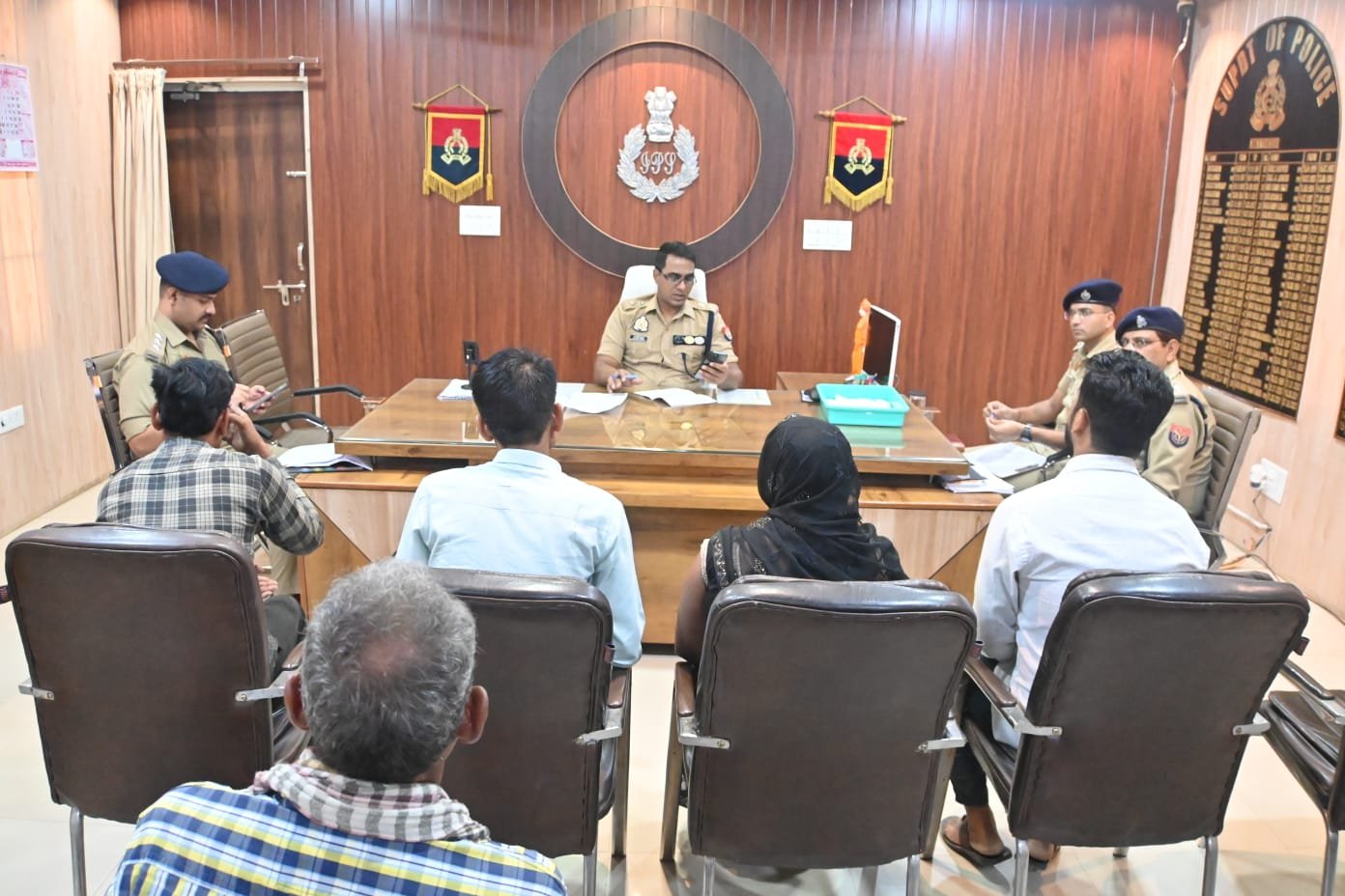वरिष्ठ पुलिस अधीक्षक आजमगढ़ डा अनिल कुमार, अपर पुलिस अधीक्षक नगर श्री मधुवन कुमार सिंह, सहायक पुलिस अधीक्षक प्रशिक्षणाधिन प्रेम सुख दरिया व क्षेत्राधिकारी बुढ़नपुर श्री कौश्तुभ त्रिपाठी द्वारा पुलिस कार्यालय आजमगढ़ में आयोजित जनसुनवाई के दौरान आमजन की समस्याओं को गंभीरता से सुना गया।